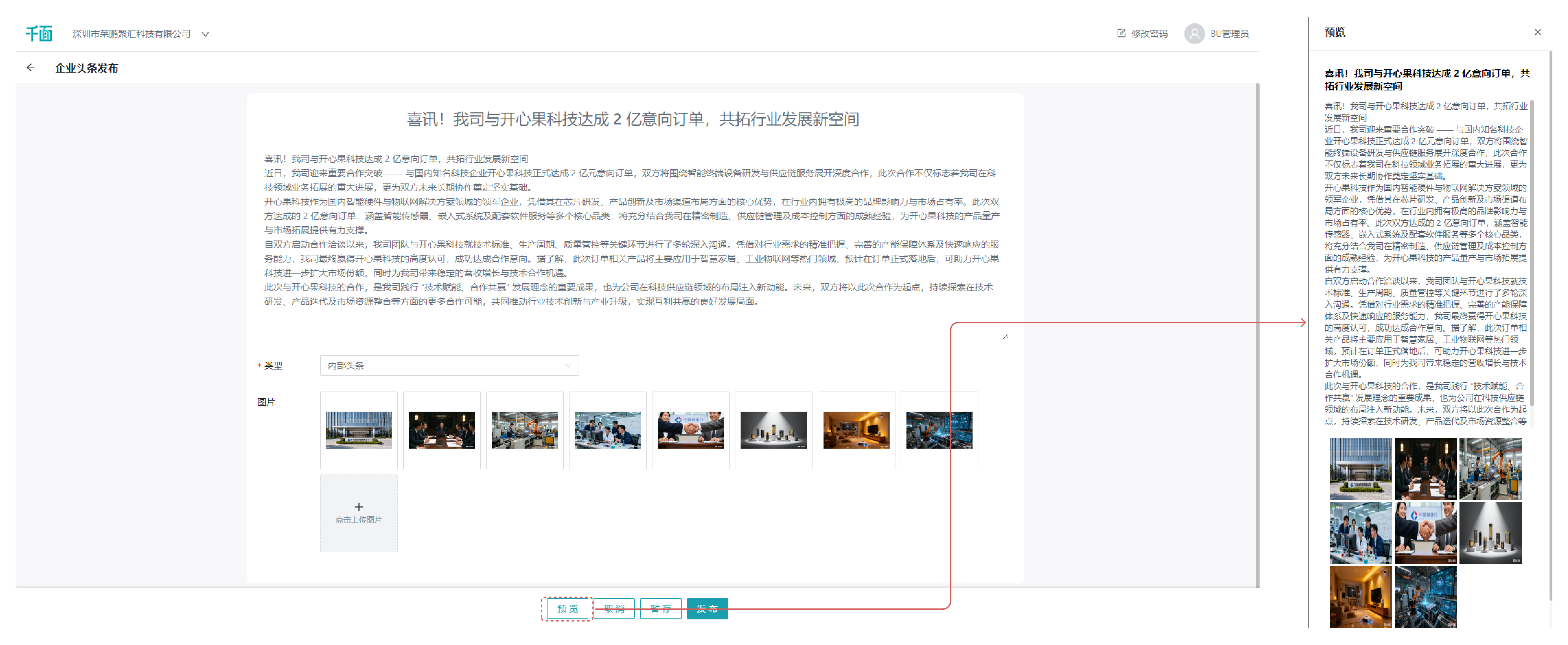 该界面可由管理用户进行企业头条的发布,发布完成且审批通过后,小程序用户可在千面小程序中查看到对应的头条内容;