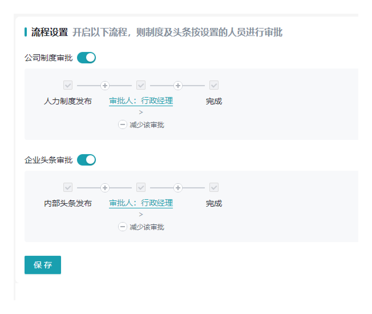 流程设置,当对应的开关开启时,相关制度和头条发布后,会产生对应的审批流。如关闭时则不会产生审批流,相关发布直接生效。