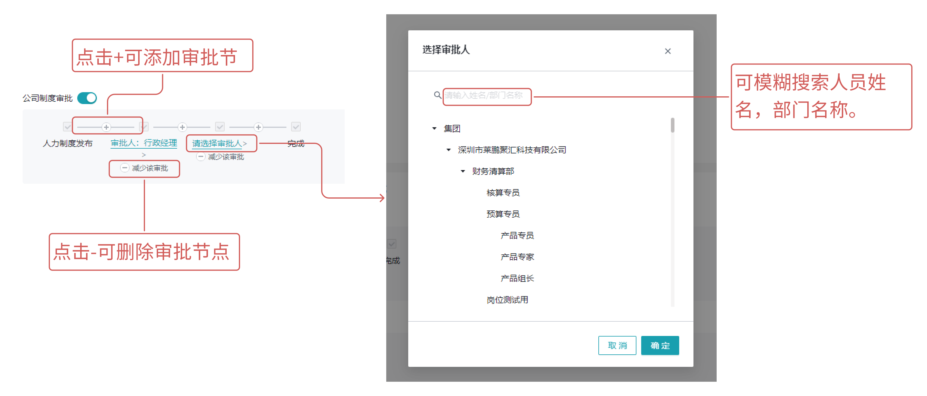 以公司制度审批配置为例,配置流中可增加和删除节点,并对节点的审批人进行指定人员选择。