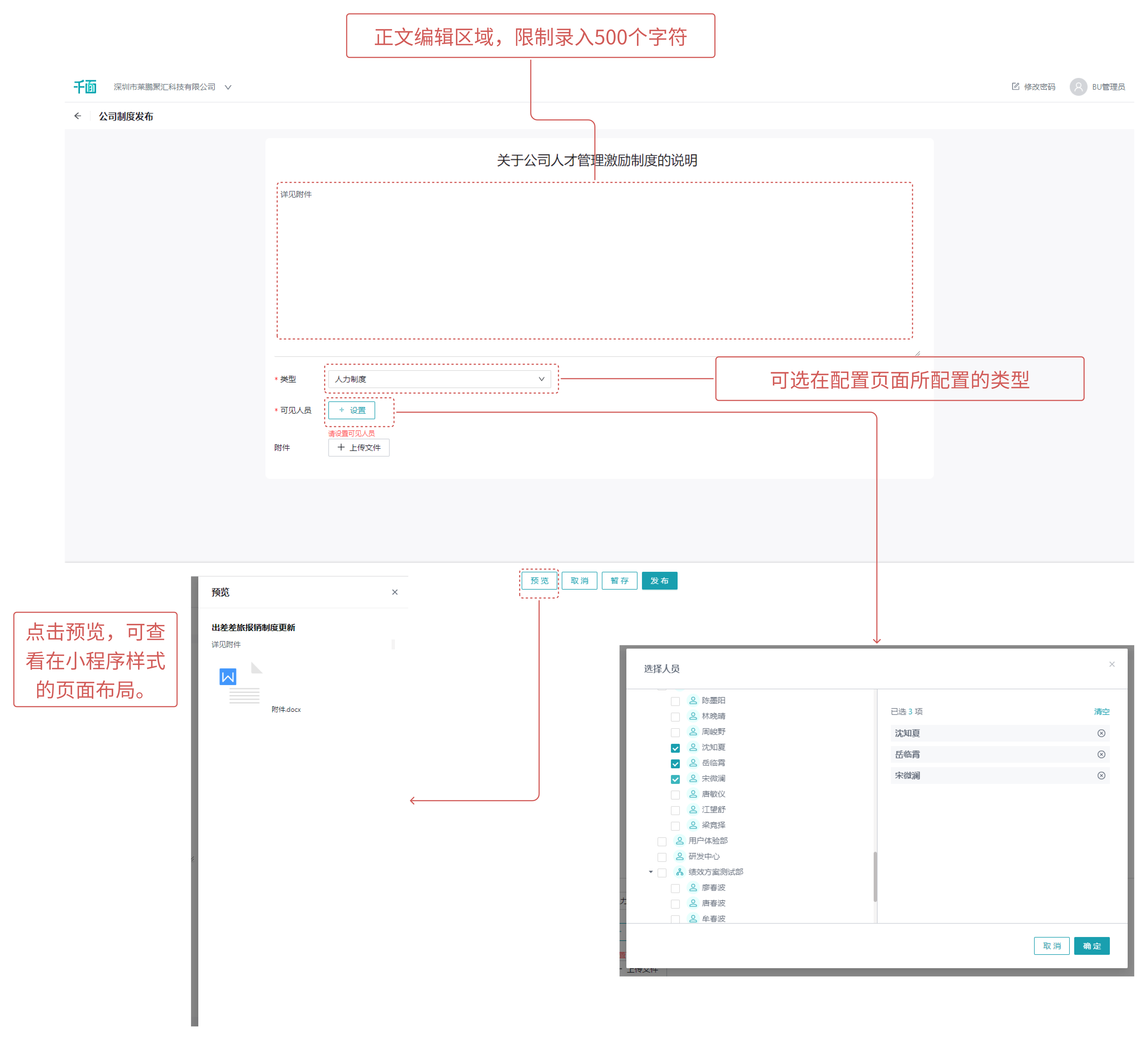该界面可由管理用户进行公司制度的发布,发布完成且审批通过后,小程序用户可在千面小程序中查看到对应的制度内容;