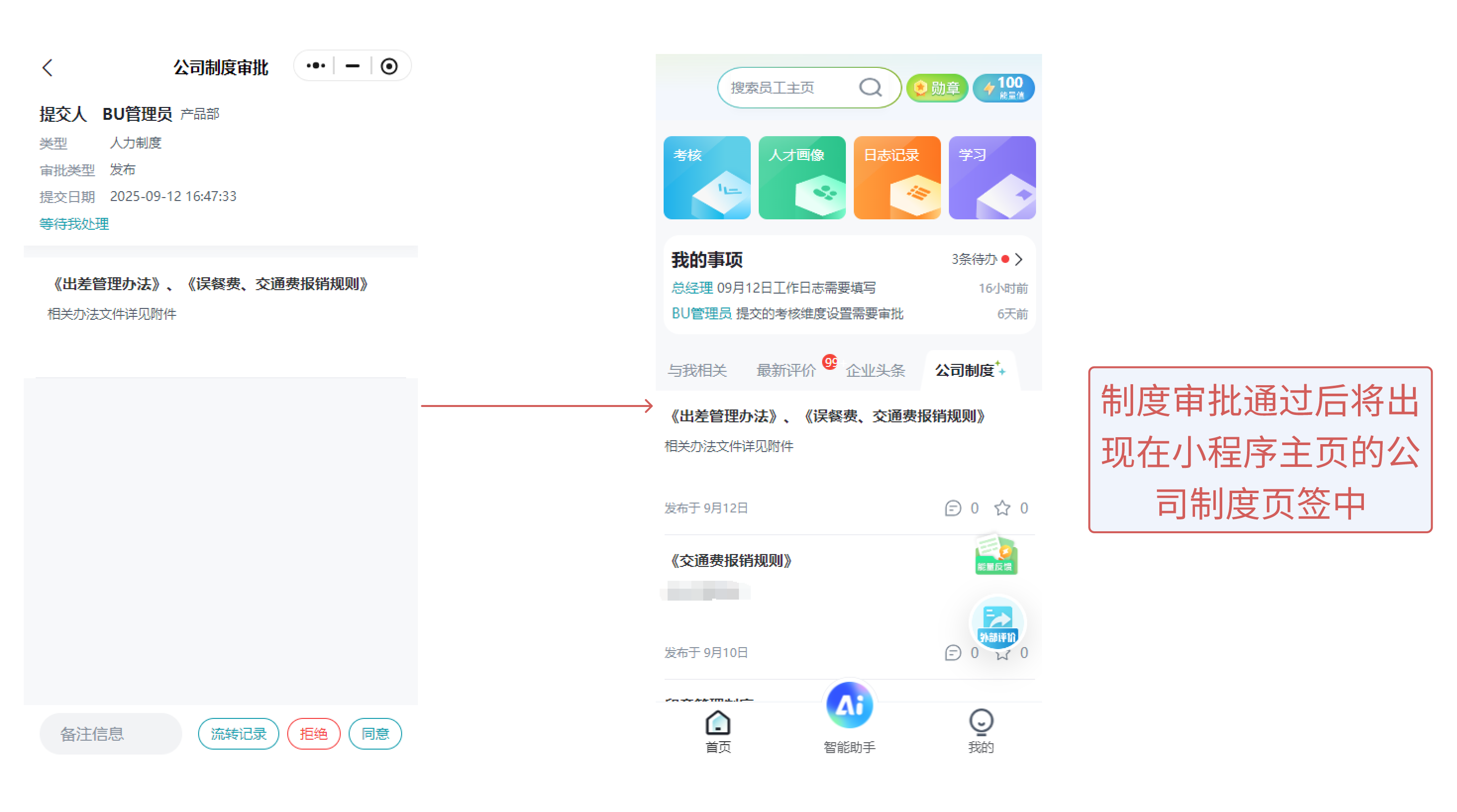 根据所设置的审批流,审批人员在小程序端中我的事项功能将收到所提交的制度内容,并可查阅审批,全部审批通过后,将自动展示至小程序>大厅>公司制度页签下,且仅有所设置查看范围的人员可以查看